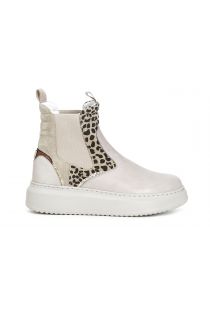 Bottines avec élastique latéral facilitant le chaussage et empeigne avec inserts tachetés et insertions laminées.
