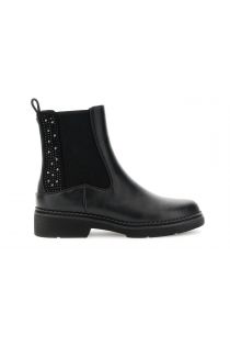 Bottines noires pour femme en similicuir, à brides élastiques sur les côtés. Strass et clous décoratifs à l'arrière pour une touche glamour. Semelle intérieure en cuir. Talon de 3,5 cm.