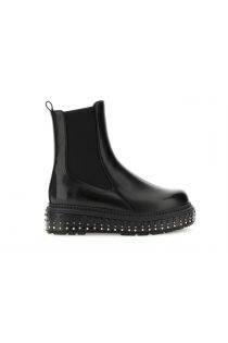 Bottines en similicuir avec empiècements élastiques latéraux, semelle intérieure en cuir et semelle compensée de 3,5 cm ornée de clous. Un style audacieux et un confort optimal en toute occasion.
