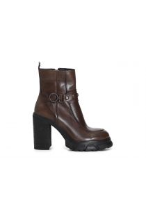 Bottines en cuir avec plateau de type mocassin à talon haut et avec passant enrichi de cabochons. Plateau en caoutchouc décoré d'un motif rappelant le monde du sport. Fermeture éclair interne et lacet décoré faisant office de chevillère.