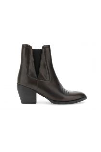 Bottine en cuir à la cheville, dotée d'un élastique sur le côté, d'une silhouette fuselée et de surpiqûres apparentes. Doublure et semelle intérieure en cuir. Talon bloc de 7 cm. Un incontournable audacieux pour un look urbain.