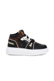 Bottines en cuir de style sportif et dynamique, sur une semelle remontante avec laçage et insertions laminées à motif animalier. Logo en métal sur le côté.