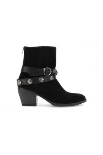 Bottine rock en daim avec double bride cloutée à la cheville et fermeture éclair à l'arrière. Détails audacieux et talon bloc de 7 cm pour un style affirmé et irrésistible.