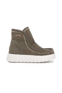 Bottines en daim avec doublure en fausse fourrure. Logo en métal et semelle surélevée. Des surpiqûres apparentes décorent la bordure.