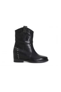 Bottines montantes en cuir avec cabochons latéraux et semelle compensée interne. Un jeu de surpiqûres crée harmonie et dynamisme.