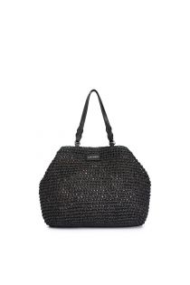 Cabas fait main au crochet fermeture magnétique et boucle avec mousqueton sur les hanches étiquette avec logo en relief et feuille d'or.