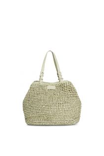 Cabas fait main au crochet fermeture magnétique et boucle avec mousqueton sur les hanches étiquette avec logo en relief et feuille d'or.