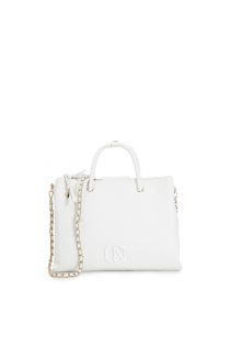 Fourre-tout avec poignées tubulaires. logo gaufré sur toute la surface et accessoire ton sur ton. tirette tressée avec breloque. bandoulière avec chaîne incluse.