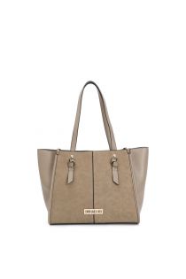 Cabas en matière granuleuse et effet suède sur le cadran avant. attache poignée avec noeud sur les côtés et plaque siglée en métal. fermeture à glissière.