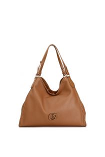 Grand cabas en matériau à effet martelé. logo appliqué effet cuir avec piqûres à main et bordures sur les côtés. très grande capacité et double portabilité (cordon de serrage interne). fermeture par aimant.