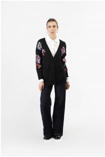 Cardigan à encolure "v" en fil de cachemire avec fleurs en sequins brodées. doux et chaud c'est une proposition idéale à porter en hiver associé à un jean et des amphibiens pour un look tendance de jour ou de bureau.