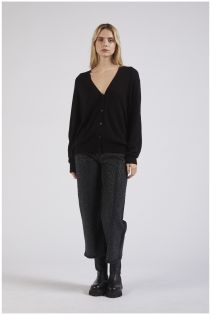 Cardigan réalisé dans un fil mélangé d'angora chaud et doux. la chemise reproduit notre slogan "be noir" sur le dos dans une couleur contrastée. une délicate ligne de strass encadre l'inscription.