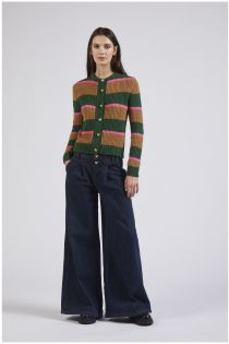 Cardigan à manches longues en fil de laine viscose disponible en un coloris rayé et trois coloris unis.