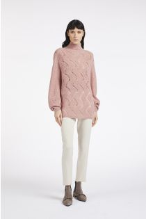 Chandail à col roulant élégant avec motif ajouré, manches larges, réalisé en fil d’angora mélangé.