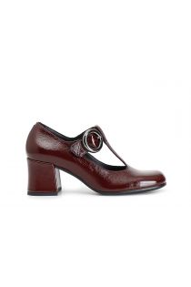 Chaussures pour femme en cuir verni au style rétro avec lanière et grande boucle. la pointe et le talon sont carrés. la semelle intérieure est en cuir.