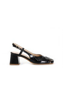 Chaussures ouvertes derrière en cuir verni avec empeigne tressée. talon de 5 cm gainé en cuir