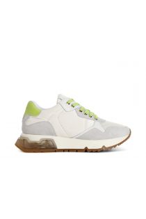 Chaussures running blanches pour femme en nylon et daim. encolure et lacets colorés.