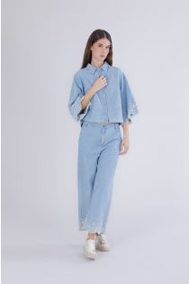 Chemise en jean courte à col classique et fermeture sur le devant. les manches courtes brodées apportent une touche féminine et sophistiquée. parfaite pour des looks d'été décontractés et chics et des associations modernes. le mannequin mesure 1.75 m et porte une taille s. coupe : standard.