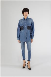 Chemise oversize à manches longues et applications de sequins sur les poches. réalisé en toile denim chambrie. fermeture avec boutons clips. parfait à combiner avec une paire de jeans.