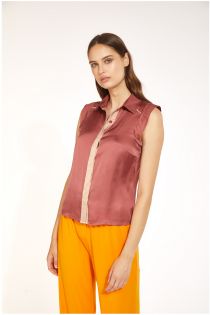 Chemise sans manches en satin de viscose avec un léger profil contrastant au niveau du boutonnage