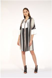 Chemisier à manches kimono en tissu de viscose imprimé. Le plastron et le bas des manches sont réalisés avec un tissu d’une couleur contrastante
