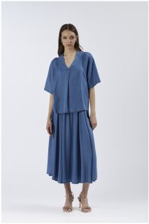 Chemisier ample en jean tencel avec un pli décoratif sur le devant qui souligne l'encolure en « v ».