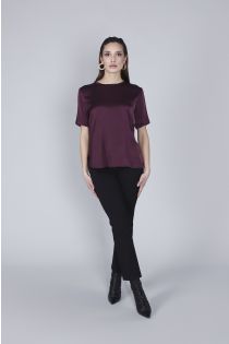 Blouse élégante à manches courtes en satin de viscose stretch, au design simple et raffiné. Coupe classique. Le mannequin mesure 172 cm et porte une taille S.