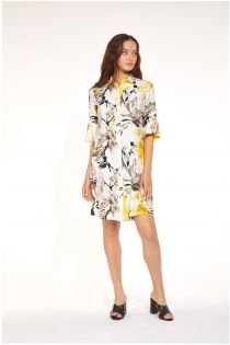 Chemisier en tissu de viscose imprimé. De fins éléments contrastants chromés décorent le boutonnage tandis que les ruches au bas des manches donnent du brio et de la légèreté.