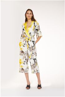 Combinaison en crêpe marocain de viscose imprimée avec décolleté croisé plongeant. Pantalon droit et manches cloche larges.