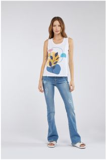 Débardeur en jersey de coton stretch avec impression appliquée multi-technique et broderie sur le devant