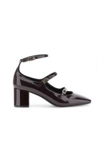 Escarpins glamour en cuir verni à trois brides et boucles dorées. Semelle intérieure en cuir pour un confort optimal. Talon bloc de 5,8 cm pour une élégance d'inspiration rétro.