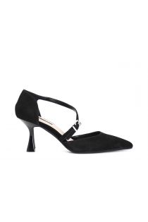 Décolleté en daim avec croisement asymétrique. la semelle intérieure est en cuir. chaussure coupe slim. le talon mesure 7 cm.