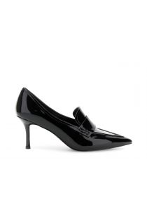 Escarpin mocassin en cuir verni noir, bout pointu et talon aiguille de 7,5 cm. Doublure et semelle intérieure en cuir pour une élégance affirmée et un confort supérieur.
