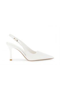 Escarpin slingback en cuir nappa à bout pointu. doublure et semelle intérieure en cuir. talon bobine de 8.5 cm. élégant et lumineux idéal pour les tenues habillées et les soirées spéciales. confort et style à chaque pas.