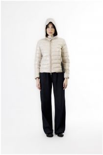 Doudoune courte à la forme essentielle confectionnée en nylon ultraléger à la finition brillante. le vêtement comporte une capuche d'urgence cachée à l'intérieur du col. polyvalent et pratique un article indispensable dans la garde-robe de la nouvelle saison automne-hiver.