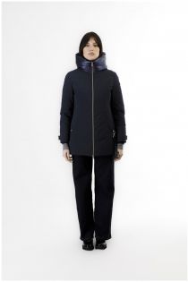 Doudoune à capuche fixe en tissu contrasté en tissu soft shell. modèle vissé au look féminin. fermeture zippée à double curseur. a porter pour aller travailler en cas d'intempéries pour une balade au grand air en famille ou entre amis.