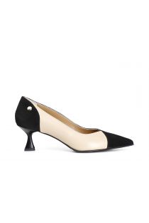 Escarpins bicolores pour femme en daim et cuir nappa au style élégant et féminin. talon bobine de 65 mm de hauteur. semelle intérieure en cuir souple.