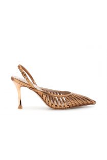 Élégants escarpins à bride arrière finition bronze ou argent avec doublure et semelle intérieure en cuir empeigne tressée à fines brides et bout pointu. le talon fin de 8.5 cm apporte une touche féminine faisant de cette chaussure l'accessoire idéal pour des tenues raffinées et audacieuses.