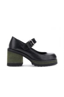 Escarpins en cuir noir avec bride ajustable et boucle. Semelle crantée et talon bloc contrastant de 9 cm. Doublure et semelle intérieure en cuir. Design audacieux et contemporain.