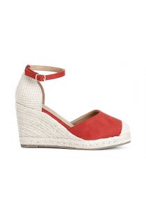 Sandales en microfibre sur cale en corde de 10.5 cm et plateforme de 3.5 cm. bride à la cheville. semelle intérieure en cuir. chaussure fermée devant et derrière. clous dorés sur le dessus et sur la bandoulière.
