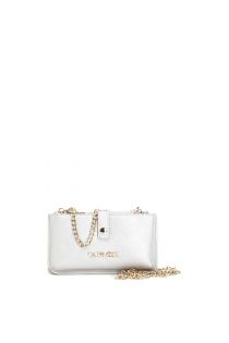 Étui pour téléphone portable et cartes en matière saffiano avec poignée en chaîne et bandoulière.
