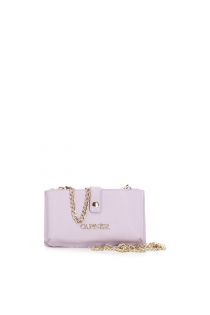 Étui pour téléphone portable et cartes en matière saffiano avec poignée en chaîne et bandoulière.