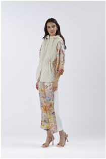 Gilet matelassé sans manches avec capuche pratique. le vêtement est réalisé en nylon impalpable avec une finition mate et un matelassage en losanges. élastique à la taille.