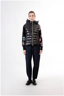 Gilet court de forme essentielle en nylon ultraléger avec finition brillante. le vêtement a une capuche amovible. vêtement parfait pour l'attaque de la saison.