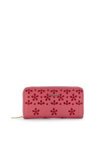 grand portefeuille rond zippé en tissu effet nappa et broderie san gallo cherry red
