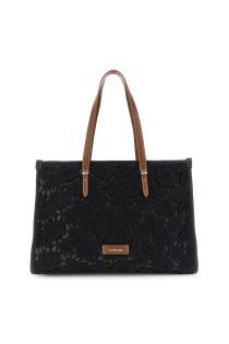 Grand sac cabas élégant en macramé orné de poignées et d'étiquettes contrastantes effet cuir. spacieux et polyvalent il est doté de boucles métalliques et idéal pour l'été la ville et les sorties décontractées. dimensions : 40 cm (longueur) × 28 cm (hauteur) × 15 cm (profondeur)