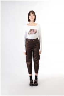Jean coupe cocoon en gabardine lamée. cinq poches et fermeture boutonnée et zippée cachée. vêtement avec une note contemporaine d'un classique vestimentaire. ajoute de l'originalité et du glamour à votre tenue.