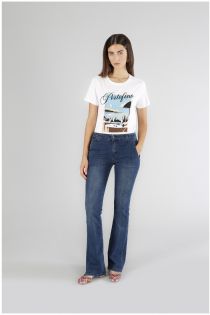 Jean modèle anna avec une coupe évasée. fabriqué en toile super extensible. le vêtement est conçu pour envelopper la silhouette et mettre en valeur les formes. cinq poches fermeture classique et passants de ceinture.