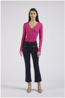 Jeans en toile denim super stretch à la ligne courte évasée. les poches spéciales sur le devant sont ornées de plaques personnalisées.