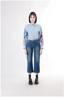 Jean en denim en toile super stretch avec coupe culotte. passants à la taille cinq poches bouton punaise logoté et fermeture zippée. etiquette au dos avec logo.